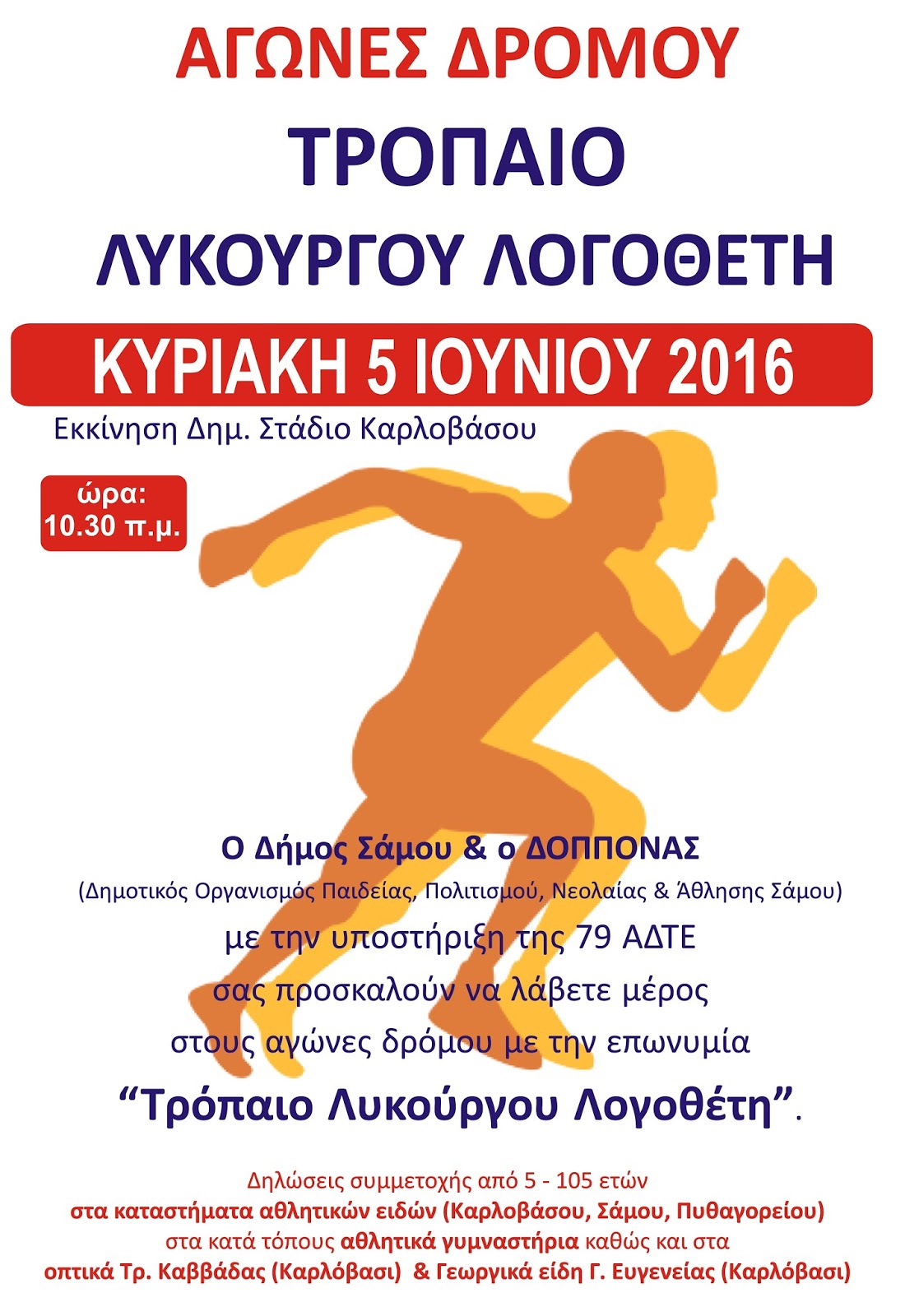 Αγώνες δρόμου με την επωνυμία "Τρόπαιο Λυκούργου Λογοθέτη" διοργανώνουν την Κυριακή 5 Ιουνίου στο Καρλόβασι ο δήμος Σάμου και ο Δημοτικός Οργανισμός Παιδείας, Πολιτισμού, Νεολαίας και Άθλησης (Δ.Ο.Π.ΠΟ.Ν.Α.Σ), με την υποστήριξη της 79 Α.Δ.Τ.Ε (Ανώτερης Διοίκησης Ταγμάτων Εθνοφυλακής).