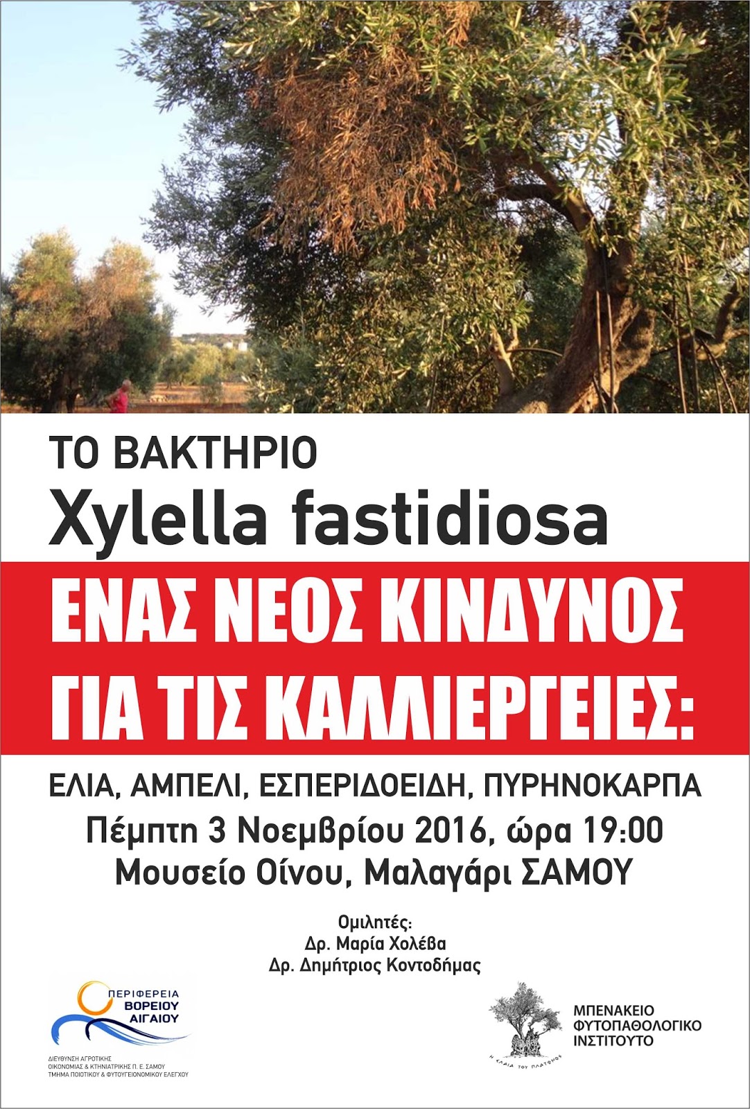 Η Διεύθυνση Αγροτικής Οικονομίας και Κτηνιατρικής της Περιφερειακής Ενότητας Σάμου σε συνεργασία με το Μπενάκειο Φυτοπαθολογικό Ινστιτούτο (Μ.Φ.Ι), διοργανώνουν την Πέμπτη 3 Νοεμβρίου ημερίδα με θέμα: "Το βακτήριο Xylella Fastidiosa. Ένας νέος κίνδυνος για τις καλλιέργειες: Ελιά, αμπέλι, εσπεριδοειδή, πυρηνόκαρπα".