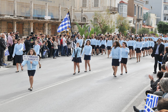 Στην παρέλαση που ακολούθησε συμμετείχαν σχολεία Πρωτοβάθμιας και Δευτεροβάθμιας Εκπαίδευσης της πόλεως Σάμου, αντιπροσωπείες μαθητών Γυμνασίων και Λυκείων από όλο το νησί, πρόσκοποι, οδηγοί, το Λύκειο Ελληνίδων, μέλη πολιτιστικών συλλόγων του νησιού με παραδοσιακές ενδυμασίες και τμήματα του Στρατού Ξηράς.